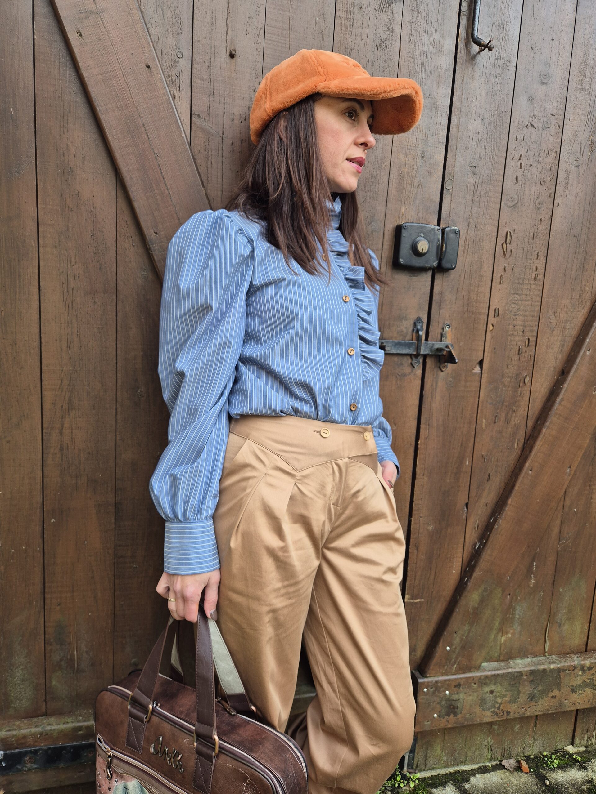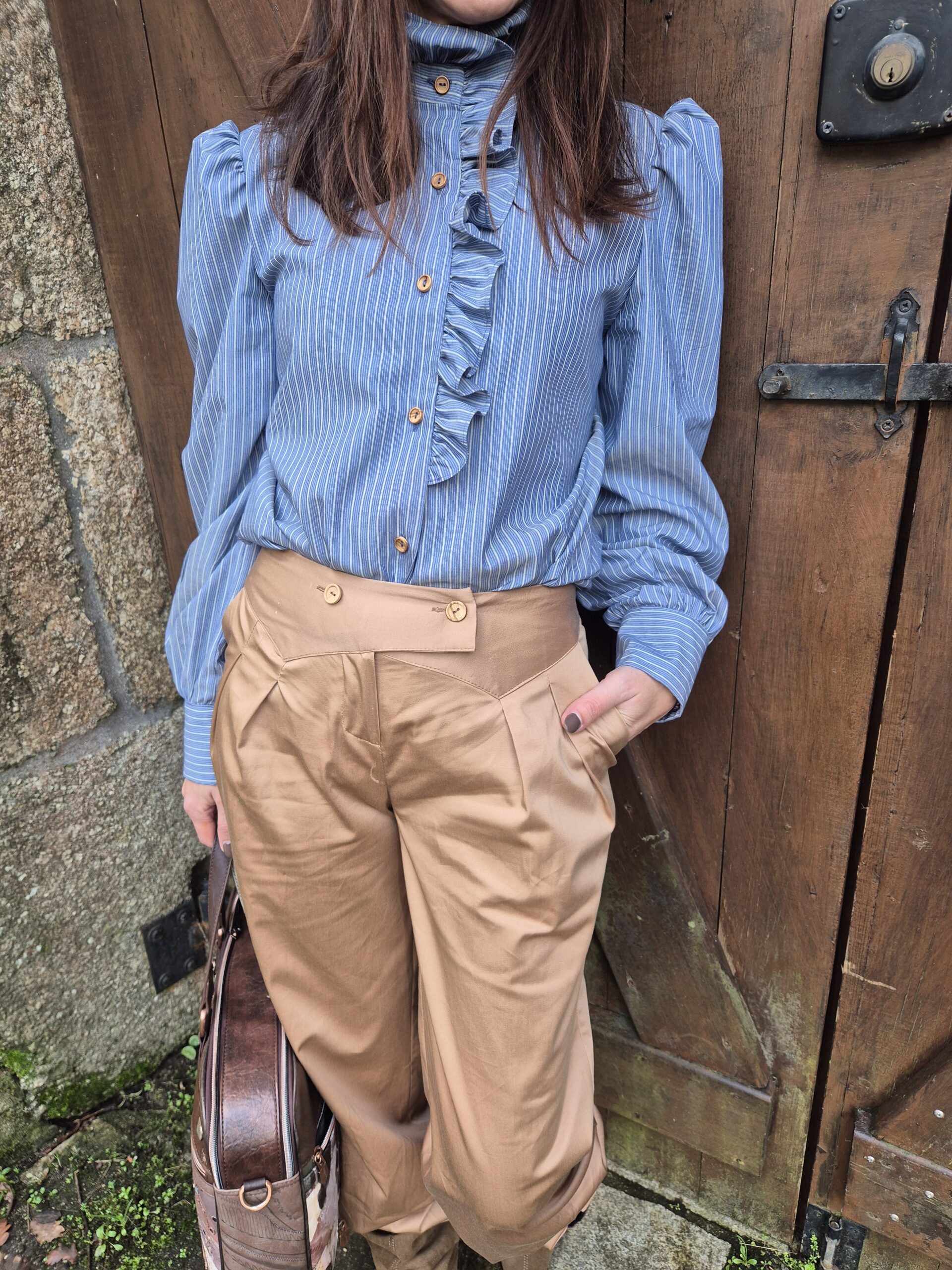 Blusa mil rayas azul de estilo romántico realizada en tejido mezcla algodón y poilester