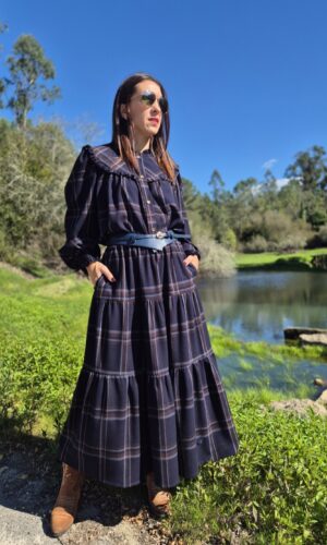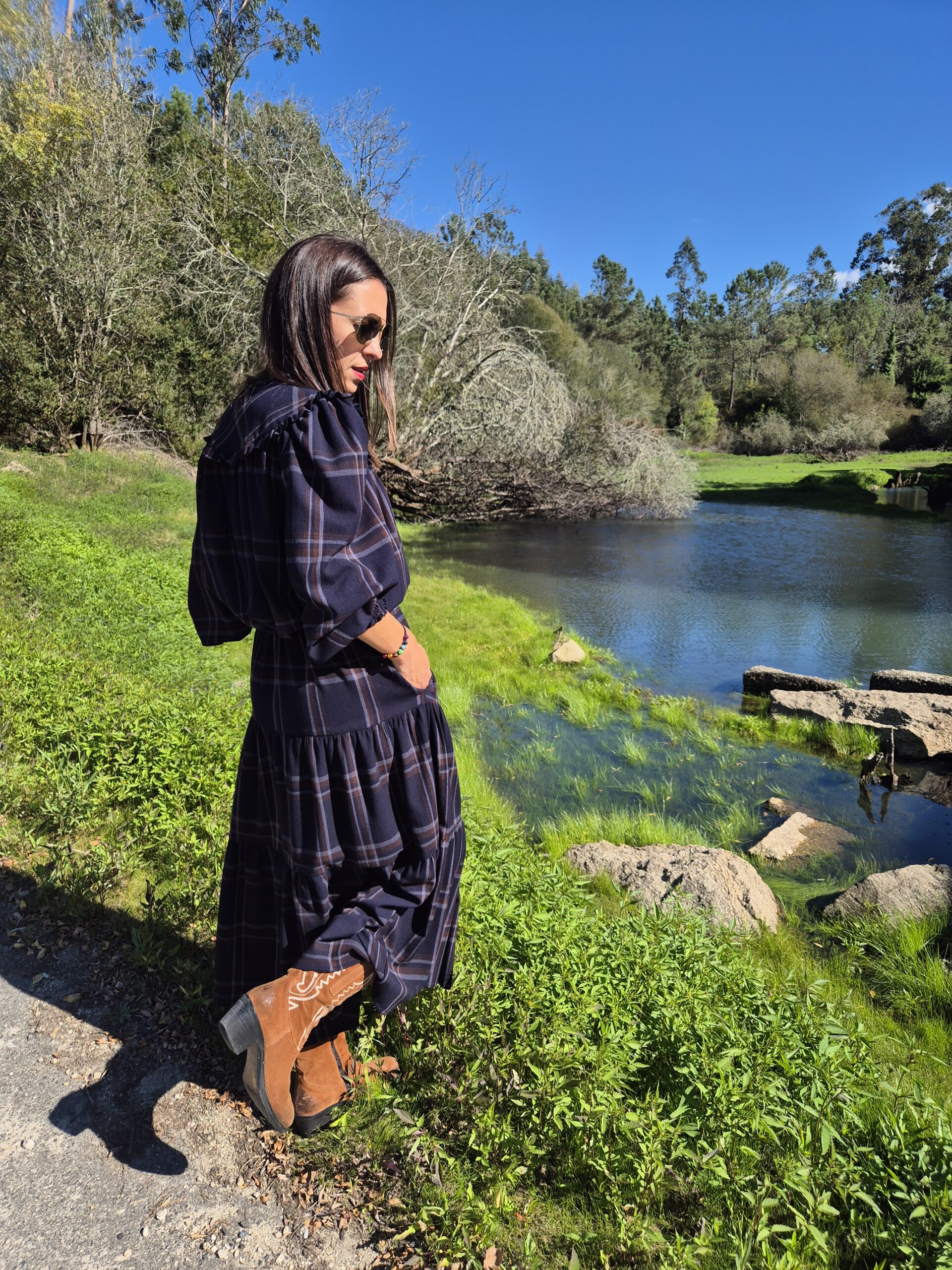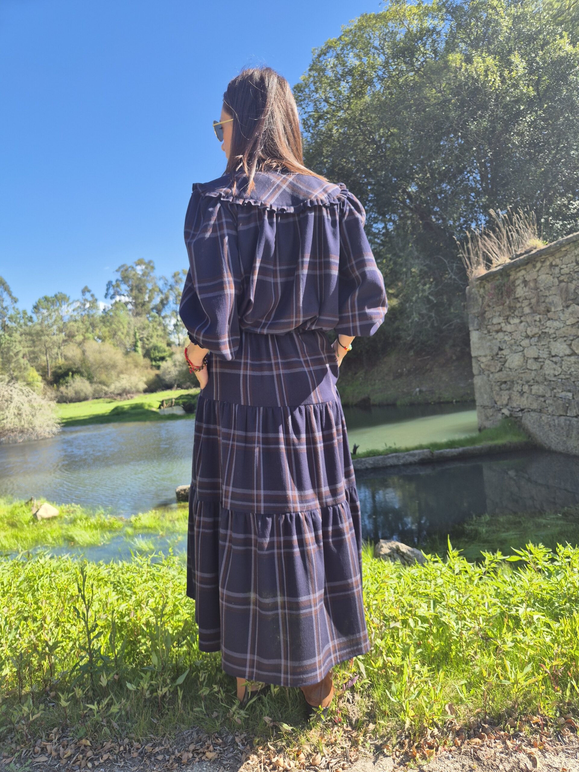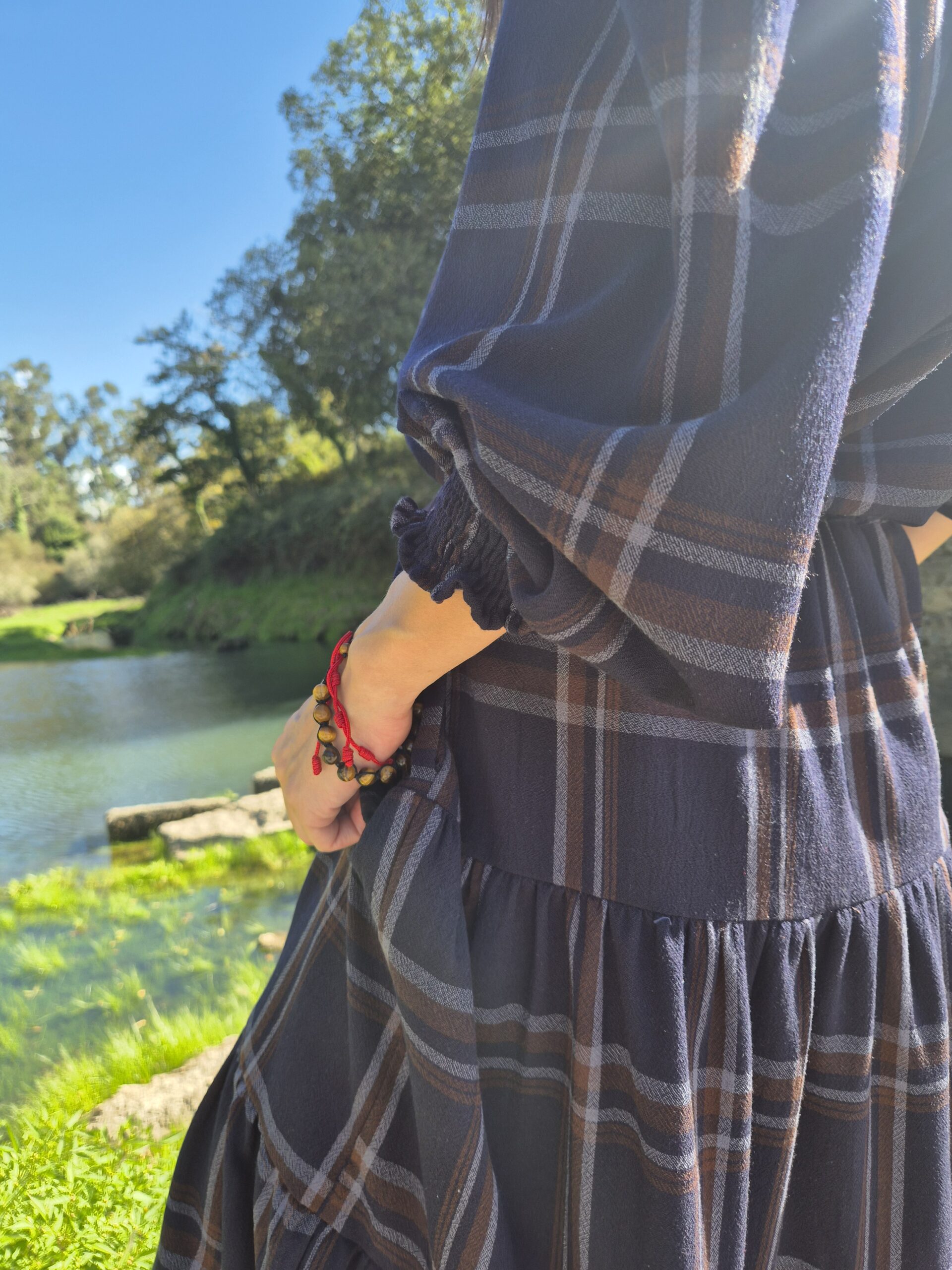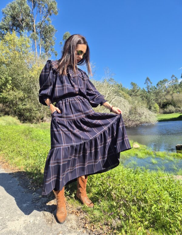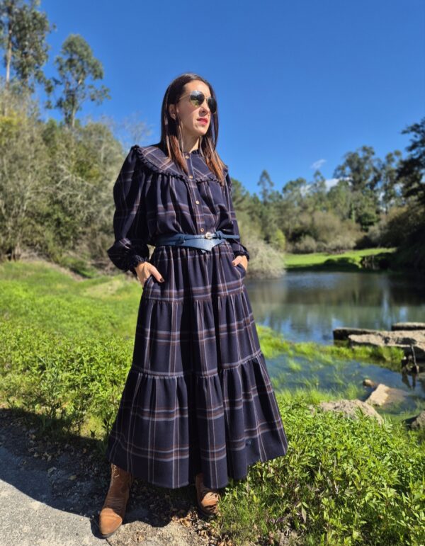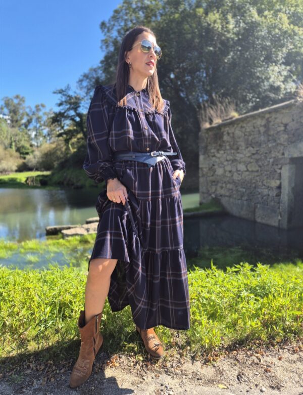 Falda larga en tejido de crep marino con cuadro marrón que aporta una increíble caída y peso