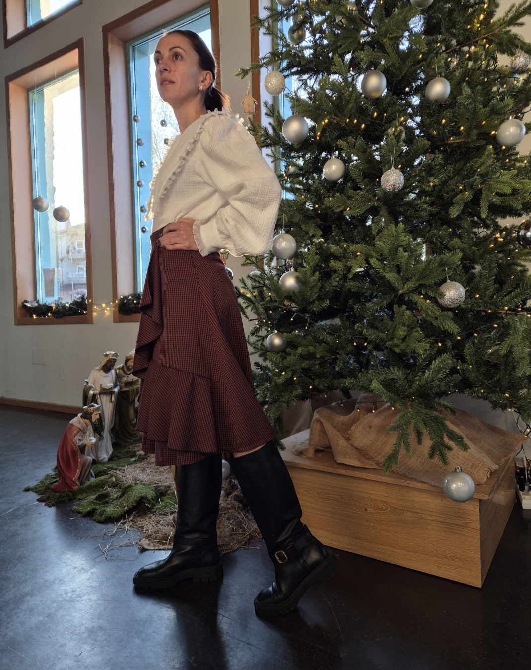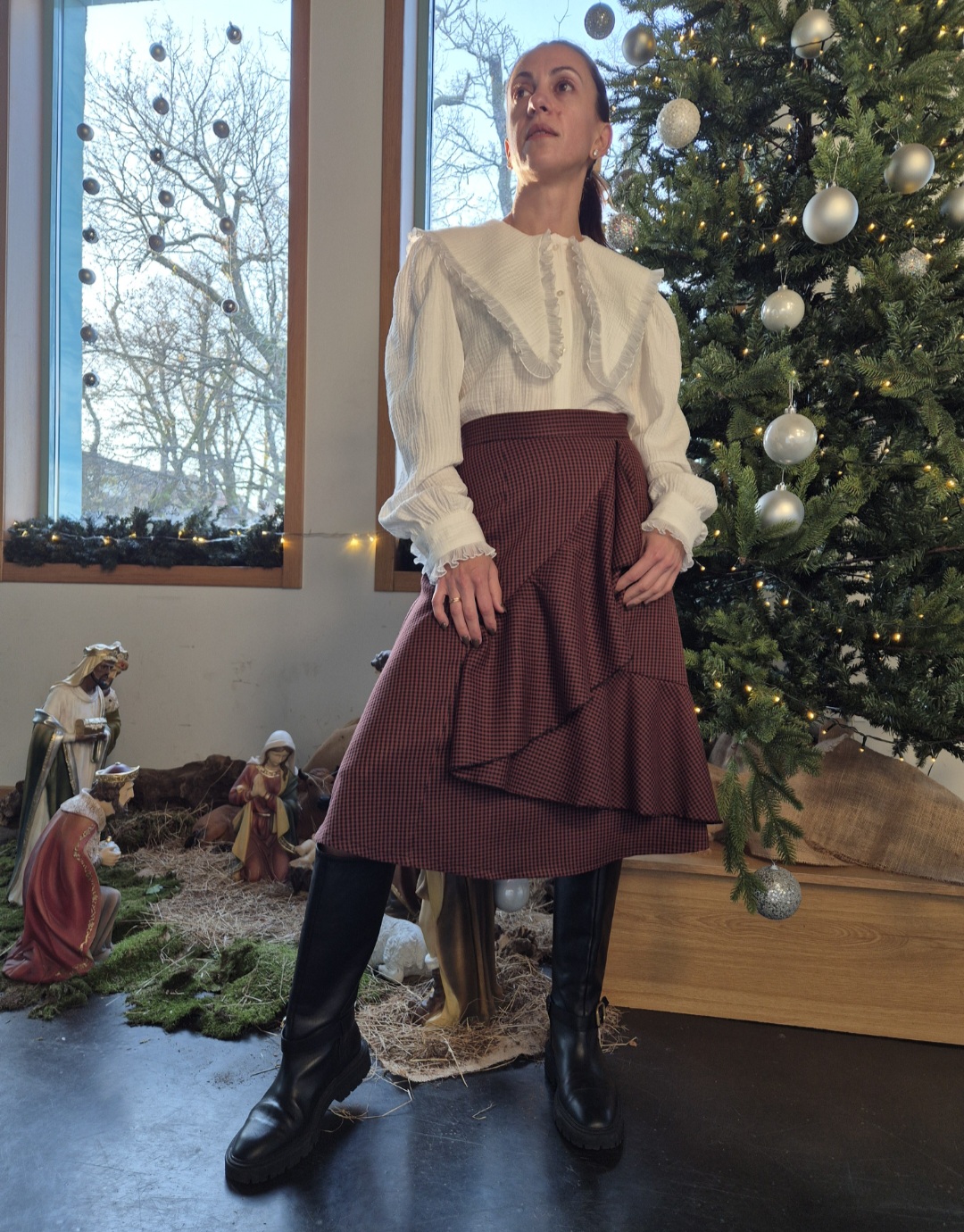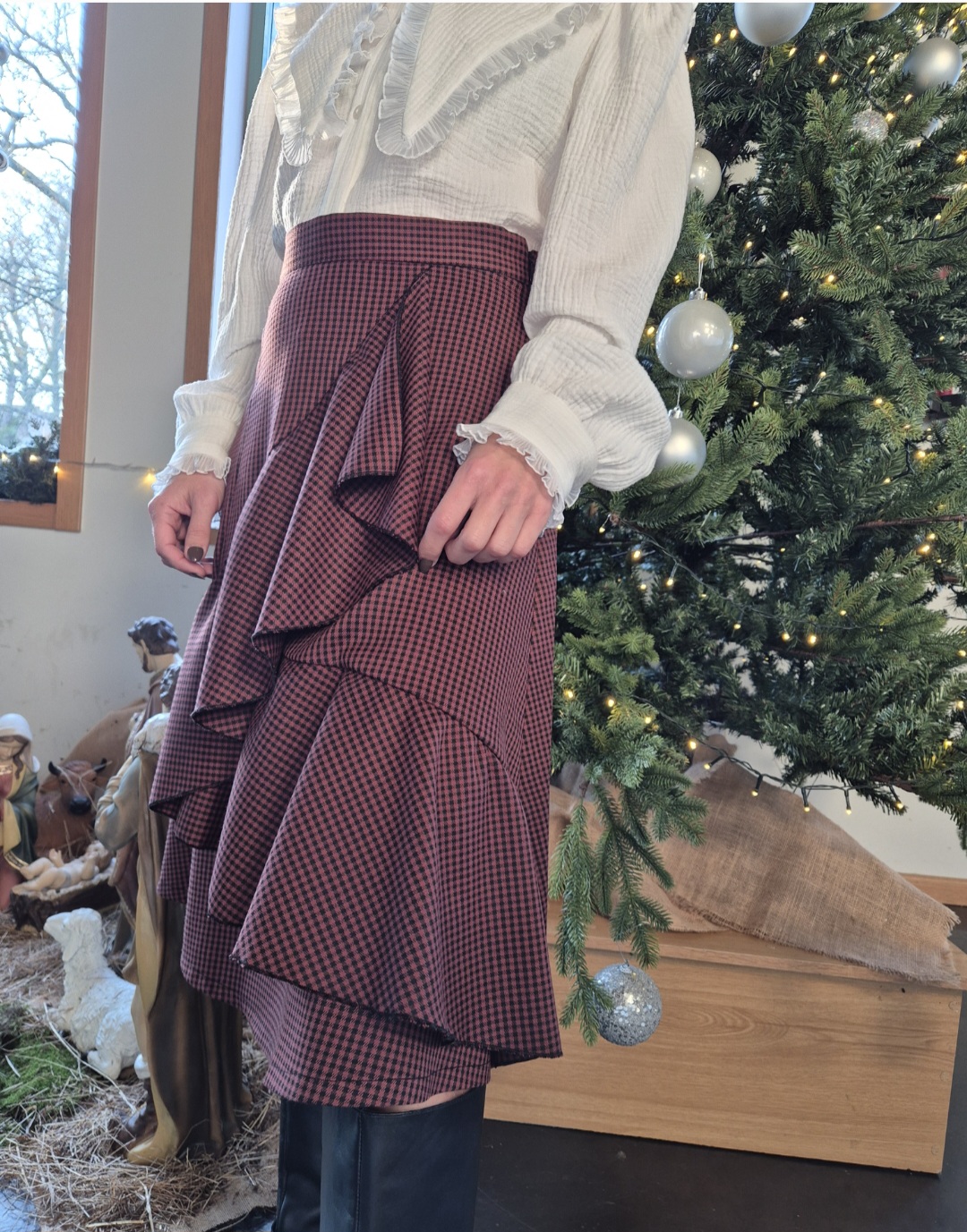 Original falda en tejido lana fría con print pata de gallo burdeos