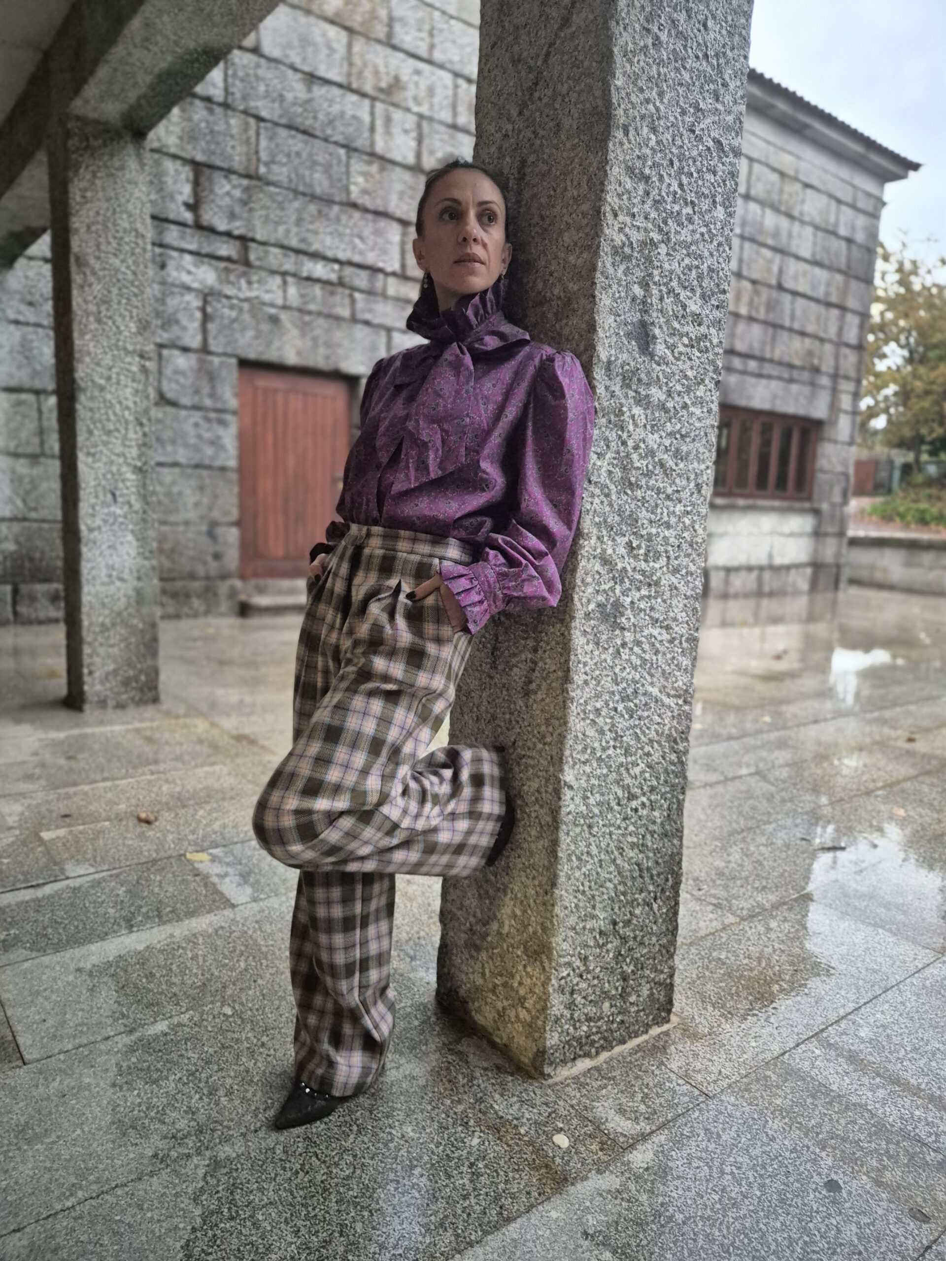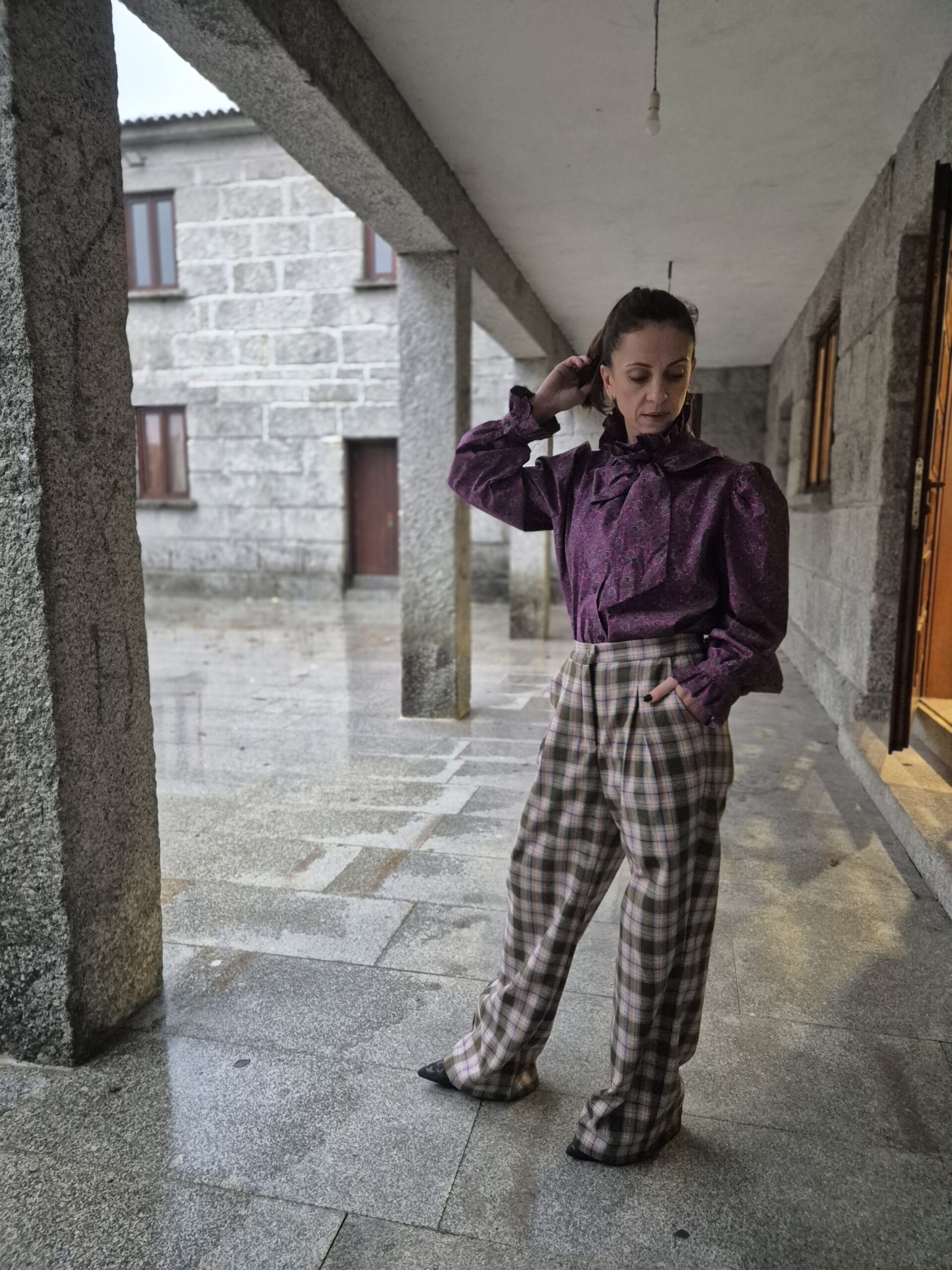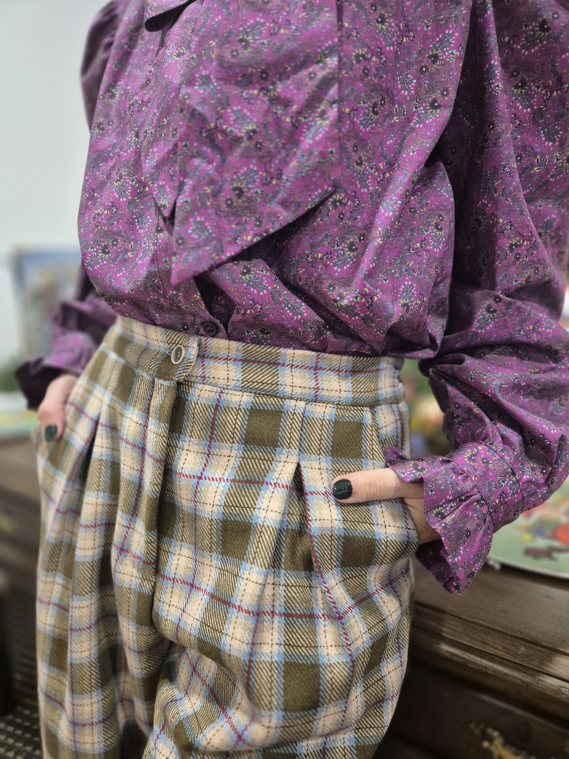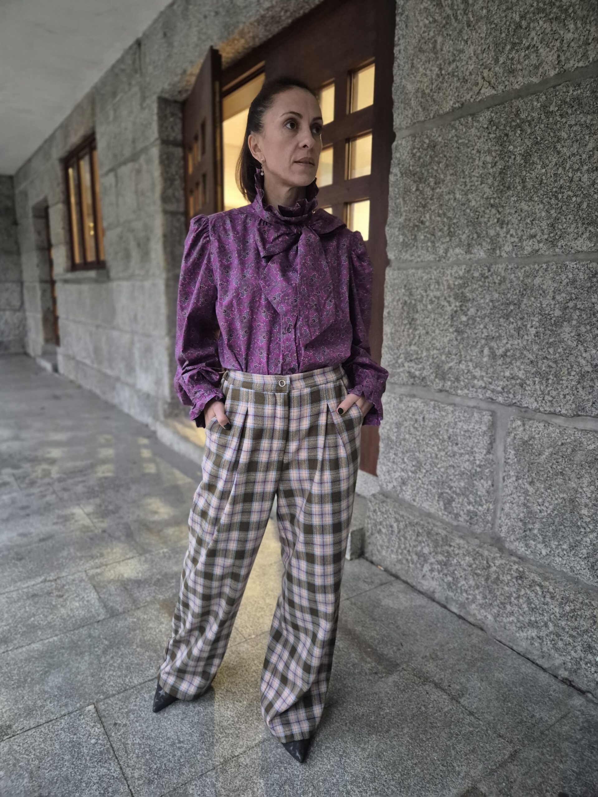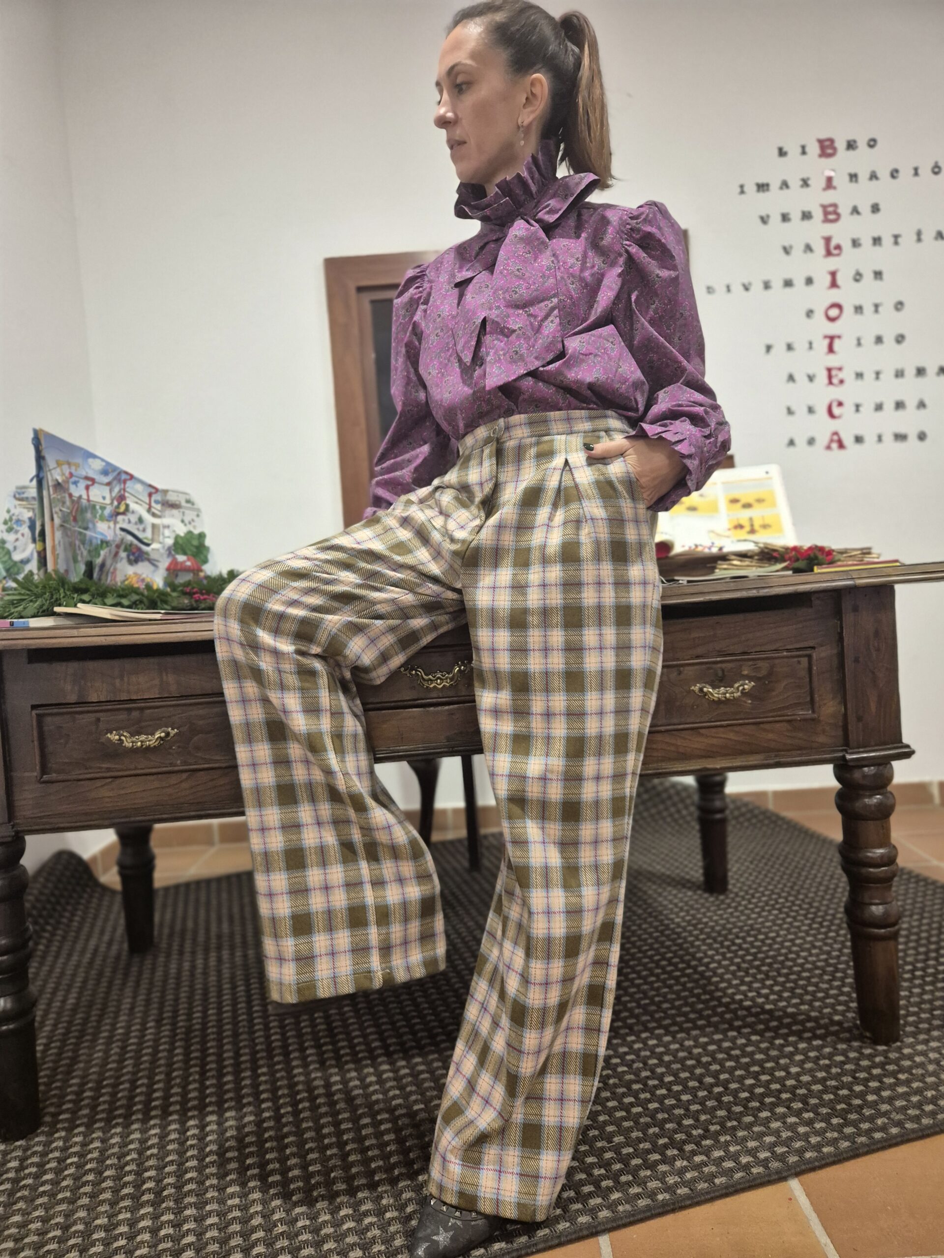 Precioso pantalón en tejido grueso de lana en cuadros tonos verde y rosa