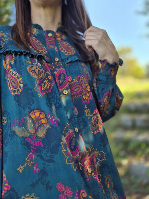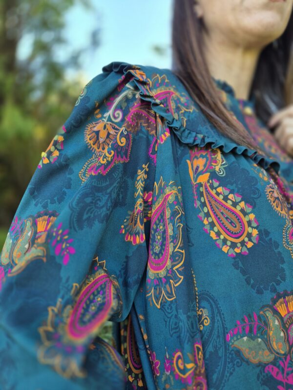 Botonadura delantera , bolsillos laterales y maxi volante en el bajo